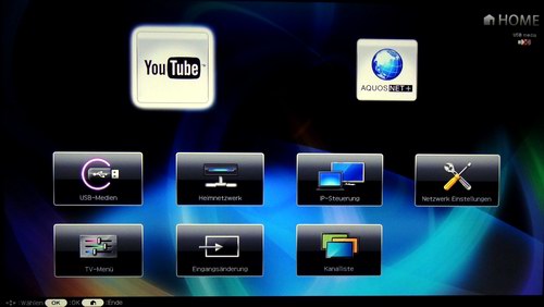 Der LE645 besitzt gegenüber bisherigen Sharp TV ein geändertes Bedienkonzept: Um in die Menüs oder das Internet zu kommen, muss man jetzt über die Home Taste auf der Fernbedienung erst in einen Home Bildschirm wechseln.