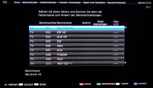 Der LE645 geht nach Länderauswahl und Standort (hier auf keinen Fall den „Shopmodus“ wählen), sowie der Tuneraktivierung zum Sendersuchlauf über, der etwas Geduld verlangt. Nach Abschluss des Suchlaufes wird eine rudimentäre Vorsortierung vorgenommen, HD Sender werden bei dieser nicht berücksichtigt. Die anschließende manuelle Sortierung erlaubt das vollständige Löschen von Sendern, zum eigentlichen Sortieren ist man auf die typische „Sender Verschiebe Methode“ angewiesen.