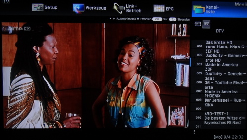 Kanal Liste mit EPG Daten und Menü Struktur.