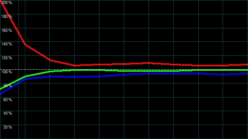 Den resultierenden Farbraum dieser Einstellung sehen wir im Diagramm oben: Es zeigt, dass die Grundfarben, die zur Mischung aller Farben genutzt werden, sehr nah bei ihren Sollfarben liegen (Ecken der des Dreiecks). Dies gilt nicht nur für ihren Farbton, sondern auch ihre Helligkeit. Die Sekundärfarben Zyan und Magenta sind nicht ganz so gut abgestimmt, liegen aber in einem akzeptablen Toleranzbereich.