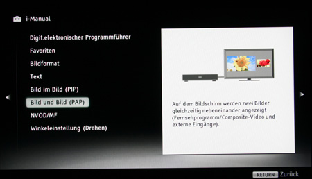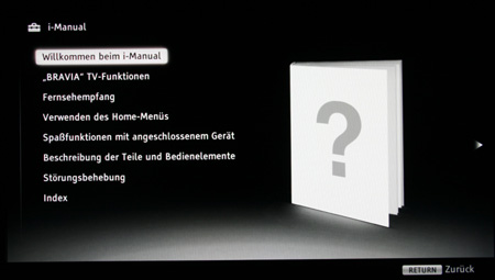Jetzt kommen wir zum Hauptkritikpunkt der Bedienung: Lediglich für Anschluss und Aufstellung hat der Hersteller eine schriftliche Anleitung für nötig befunden, für weitere Bedienschritte hingegen wird man auf das im TV Menu integrierte „I Manual“ verwiesen. Die Idee ist zwar gut, aber es werden nicht annähernd alle Bedienfeatures erklärt. Wenn man also alle Möglichkeiten des KDL-55EX505 erfahren möchte, bleibt nur die „Trial and Error“ Selbsterfahrung.