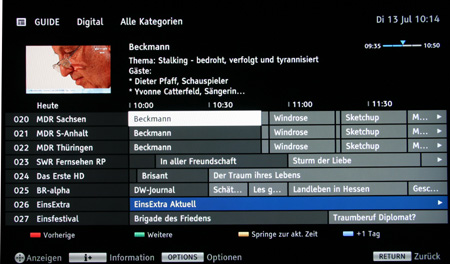 Das EPG ist graphisch zwar sehr schön aufgeführt und öffnet auch recht schnell, aber es werden nur Sender geladen, auf denen sich der Nutzer gerade aufhält, sowie auf dem gleichen Transponder liegende Programme. Um das EPG vollständig zu laden, muss man also der Reihe nach durch alle Programme schalten. Geht man in den Stand-by, sind alle Daten wieder weg.