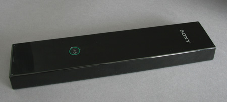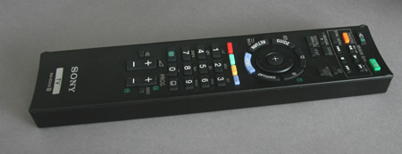 Die Fernbedienung ist in einem Mix aus mattem Kunststoff auf der Front und Hochglanz-Kunststoff auf der Rückseite ausgeführt. Die hochglänzende Oberfläche zieht Fingerabdrücke natürlich magisch an. Sie wirkt etwas eckig und ist nicht wirklich ein „Handschmeichler“, es gab schon Sony Fernbedienungen, die ergonomischer geformt waren. Die Bedienung ist als Innovation so gearbeitet, dass sie umgedreht auf dem Wohnzimmertisch liegend nicht direkt als solche erkennbar sein soll.
