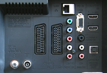 An der Rückseite finden sich zwei weitere HDMI 1.3 Eingänge, weiterhin ein LAN Anschluss, die Antennen Anschlüsse für SAT sowie Kabel/DVB-T und ein weiterer USB Anschluss, an dem auch der als Zubehör lieferbare WLAN Adapter andocken kann.