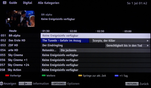 Das EPG ist leider wieder nur eine Kanal-basierte Lösung mit Wartezeiten beim Laden. An diese Stelle ein Aufruf an die Hersteller: Bitte, Bitte, liebe Hersteller, integriert spätestens in der nächsten Generation Internetbasierte Programmdienste!