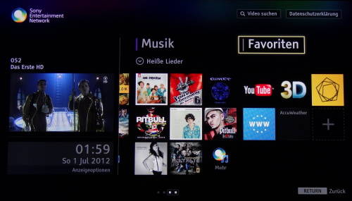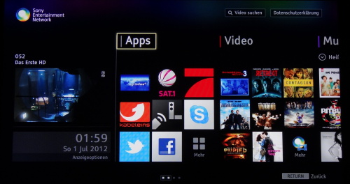 Der Zugriff auf die obligatorischen Applikationen erfolgt über ein gesondertes SEN Menü. Allerdings müssen wir feststellen, dass Sony hier nur Video basierte Dienste anbietet, Bild oder Welt Apps zum Lesen werden nicht geboten.