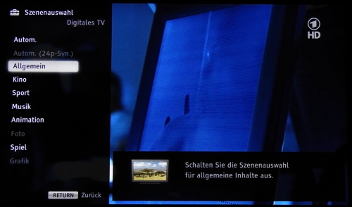 4.1.1 Farbraum Wie entlockt man dem HX85 gute Farben? Zur Beantwortung dieser Frage müssen wir etwas weiter ausholen: Im Menü findet sich eine so genannte „Szenenauswahl“ (vgl Screenshot unten), werksseitig steht diese auf einer „Automatik“ Funktion, die alles macht, nur keine natürlichen Bilder. Unter den weiteren Auswahlmöglichkeiten haben sich die Modi „Allgemein“ sowie „Kino“ als am nächsten zur Norm erwiesen. Aber Achtung: Auch hier gibt es noch mehrere Auswahlmöglichkeiten im Bild Menü!