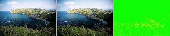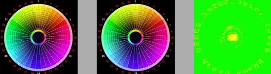 Links Original, Mitte HX85, Rechts: Farbgenauigket (DeltaE)