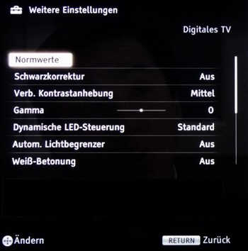 4.2.1 Kontrast Um einen möglichst guten Kontrast zu erhalten, ist es notwendig das Mikro Dimming zu aktivieren. Ab Werk ist dieses aber unverständlicherweise abgeschaltet. Die Funktion findet man in den Bildeinstellungen unter: „Erweiterte Einstellungen – Dynamische LED-Steuerung“. Diese bitte auf „Standard“ stellen.