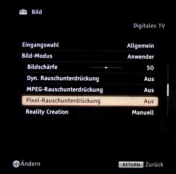 4.3.1 Signalverarbeitung Der Sony steht Werksmäßig nicht überschärft da. Der Overscan ist komplett abschaltbar, so dass Bilder ohne Beschneidung Pixelgenau wiedergegeben werden können.
