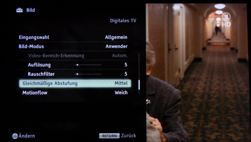 Damit nutzt das Gerät sein gutes Kontrastpotenzial maximal aus und zeigt auch in dunklen Bildelementen eine sehr gute Durchzeichnung, keine Nuancen bleiben dem Zuschauer verborgen.