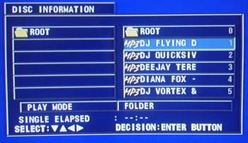 Die Bedienung der MP3-Menus lässt ebenfalls Komfort und Flexibilität vermissen. Die Benutzeroberfläche erscheint praktisch identisch zu der eines DVD-2900, mit all den in den entsprechenden Tests erwähnten Nachteilen (Keine ID3Tag/MP3Pro Unterstützung, nur 8 Zeichen-Anzeige, träge Bedienung). Nur die MP3 Kennung wurde grafisch leicht verändert. Zusätzlich ist der DVD-A11 auch zu WMA Dateien kompatibel. Die Wiedergabe ist dagegen sehr zuverlässig und führte in unseren