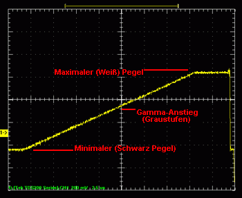 Für eine optimale Kontrastausnutzung im Rahmen der Videonorm ist eine sehr präzise Pegelgenauigkeit notwendig. Um dies zu überprüfen, haben wir den TEAC-Spieler mit einem Oszilloskop durchgemessen. Den höchsten Pegel hat die "Farbe" Weiß. Sie stellt das Maximum an Helligkeit an. Im Oszilloskop-Diagramm lässt sich die Pegelhöhe ablesen. Hier zeigt sich, dass der TEAC DV-7 nicht ganz punktgenau die Norm einhält. Mit nur ca. 95% Ausnutzung verschenkt der Player ein wenig Kontrast. Dies macht sich aber erst für Experten im Bild bemerkbar. Der Verlust lässt sich bei einem guten Projektor / Fernseher durch die Kontrast-Funktion in der Regel gut ausgleichen. Sehr gut sieht es in der Helligkeitsverteilung aus. Der DVD-Player sollte einen konstant gleichmäßigen Pegelanstieg durch alle Helligkeiten zeigen. Der TEAC erfüllt diese Norm. In keinen IRE Leveln gibt es Ausreißer, die zu einer ungleichmäßigen Helligkeitsdarstellung führen würden.