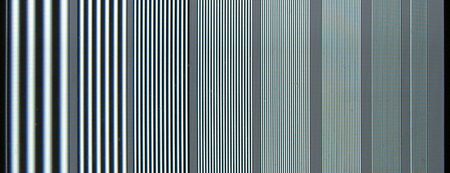 Jede Schwingung entspricht einem Schwarz-Weiß Verlauf. Man sieht, dass die "Peaks" (höchste Ausschläge) nicht stets gleich hoch liegen. Im Bild bedeutet dies, dass manche Linien dunkler erscheinen als andere. Im Film kann sich dies bei kleinen Strukturen bemerkbar machen. Bei einem Gitterzaun erscheinen manche Drähte zu hell oder dick im Vergleich zu anderen, oder so manche Fassade wirkt ein wenig unnatürlich in ihrer Darstellung. Allerdings sind dies wohlgemerkt sehr kleine Details, die nur bei genauem Hinsehen beobachtet werden können. Besser sieht es wiederum bei der allerhöchsten DVD Auflösung 6,75MHz (1 Pixel Breite) aus. Hier zeigt der TEAC Player ein sehr homogenes Verhalten. Alle Schwingungen (im Bild Linien) sind gleichmäßig mit ebenfalls