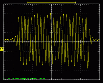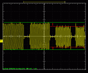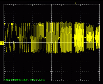 die Stärken bzw. Schwächen gemessen. Paketweise sind hier graue Balken zu erkennen, die nach rechts hin immer dünner werden. Je schärfer die Bildausgabe, desto klarer bleiben in der höchsten machbaren DVD-Auflösung die Linien zu erkennen. Auf dem Oszilloskop sieht das Ganze so aus: Die breiten Balken im Testbild sind als deutliche Sinusartige Schwingungen am linken Bildrand zu erkennen. Die Sinuswellen rutschen mit jeder höheren Auflösung im näher zusammen (rechter Bildrand). Der TEAC DV-7D zeigt ein sehr gutes Auflösungsverhalten bis 6MHz. Erst ab hier zeigen sich leichte Schwächen durch Ungenauigkeiten in der Linearität.
