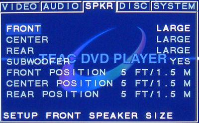 Zu unserer Überraschung befindet sich beim TEAC DV-7D auch noch ein interner Dolby Digital / DTS Decoder an Board, sollte man doch meinen, dass mittlerweile eh schon jeder Heimkinofreund einen eigenen DD / DTS Decoder im Verstärker integriert hat. Diesem sollte man auch den Vorrang überlassen, obwohl auch hier der TEAC eine durchaus ansprechende Leistung bildet. Der Frequenzraum und die Dynamik nutzen die Tonstandards angemessen aus. Im "Speaker" Menü des Setups lassen sich die Boxen sehr