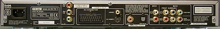 Bei den Anschlüssen sind ebenfalls keine größeren Einsparungen zu erkennen. Für jede gängige Signalart steht ein eigener Ausgang (vergoldet) zur Verfügung: Auf der Rückseite befindet sich ein YUV Ausgang (für die progressive Ausgabe), eine SCART Buchse (u.a. für die interlaced RGB Ausgabe), ein Hosiden Anschluss (für S-Video) ein Cinch Anschluss (für Composite Video), ein digitaler Koaxialausgang (für digitalen Ton), ein optischer Tos-Link Ausgang (ebenfalls für digitalen Ton) und ein Paar Analog Stereo Ausgänge. Als Extra befindet sich noch ein kompletter Dolby Digital bzw. DTS Decoder an Board, der an den sechs Vorverstärker-Ausgängen zu erkennen ist. Mit seinen zahlreichen Anschlüssen wird der TEAC den meisten Ansprüchen im täglichen Heimkinogebrauch gerecht. Nur doppelte Ausgänge brächten noch mehr Luxus, sind aber in dieser Preisklasse nicht zu erwarten.