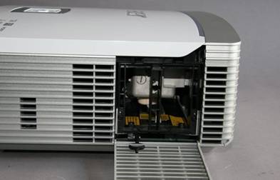 Auf der rechten Seite wird die erwärmte Luft wieder aus dem Projektor herausgeführt. Hier befindet sich auch der seitliche Lampenschacht, der ohne Schraubenzieher leicht geöffnet werden kann, ohne dass der Projektor von einer etwaigen Deckenhalterung gelöst werden muss.
