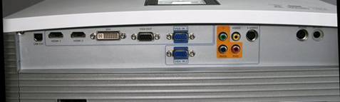 Die Anschlüsse befinden sich auf der Rückseite und bieten eine Vielfalt, die selbst in höheren Preisklassen nicht mehr so großzügig zu finden ist: Neben den mittlerweile obligatorischen doppelten HDMI Eingängen (nach dem neuesten HDMI 1.4a Standard) befindet sich hier auch noch ein DVI-D Anschluss, zwei(!) analoge VGA Eingänge, sowie 1x Komponente analog, 1x S-Video und 1x Composite. Hinzu kommen Trigger-Ausgänge, RS232 Schnittstelle und USB Anschluss, so dass die Integration in automatisierten Systemen kein Problem darstellt.
