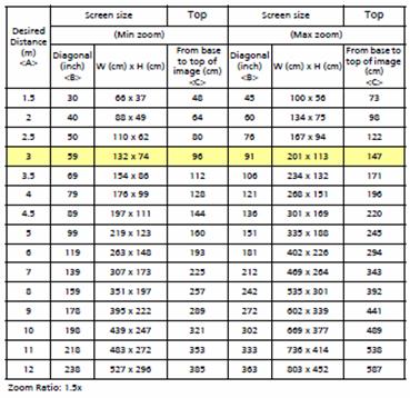 Die gängigen Heimkinobildbreiten können aus Projektionsabständen zwischen 3m und 5m realisiert werden, so dass der Projektor zu den meisten Raumbegebenheiten kompatibel ist.