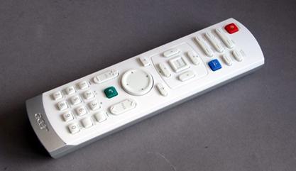 Ihr Tastenlayout ist übersichtlich strukturiert und wesentliche Funktionen schnell abrufbar. Leider wurde eine elektrische Beleuchtung nur für wenige Tasten realisiert, die in dunklen Heimkinoräumen unabdingbar ist und in dieser Preisklasse zum Standard gehört. Die Reichweite ihrer Infrarotsignale ist gut, doch reagiert der Projektor sehr träge, so dass die Bedienung stellenweise zum Geduldsspiel wird.