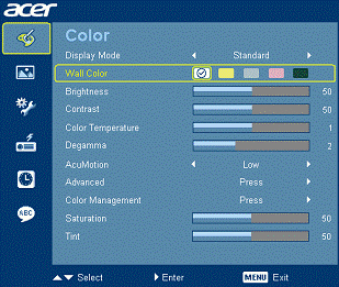 Die erste Hauptkategorie erfasst alle relevanten Bildparameter, obwohl ihr Name sich irreführend auf „Color“ beschränkt. Basierend auf verschiedenen Presets können hier Nachkorrekturen in Helligkeit, Kontrast, Gamma, Schärfe, usw. vorgenommen werden. Selbst vorgenommene Änderung können nur in einem einzigen Preset "User" konserviert werden, mehrere Speicherbänke stehen nicht zur Verfügung. Ebenfalls aktivieren lässt sich hier die 120Hz-Zwischenbildberechnung, bei Acer „Acumotion“ genannt.