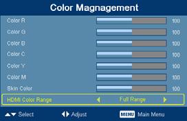 Heimkinoprofis werden aufhorchen, wenn sie das Wort „Color Management“ hören, ist eine funktionstüchtige Grundfarbenkorrektur in durchweg allen Preisklassen nach wie vor eine Seltenheit. Leider gehört auch das hier gebotene CMS zu den eher nicht funktionstüchtigen Varianten, zumindest unter üblichen Kalibrierungsstandards. Es fehlen getrennte Regler für Farbsättigung, Helligkeit und Farbton, um es effektiv nutzen zu können. Wichtig ist allerdings die HDMI-Funktion, mit der die digitalen Pegel auf den Zuspieler abgeglichen werden müssen.