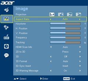 Die OSD-Menüstruktur ist von anderen Acer-Projektoren bereits bekannt und bietet eine übersichtliche Gestaltung in sechs Hauptkategorien: