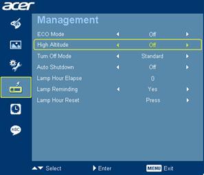 Die Abteilung „Management“ dient fast ausschließlich zur Kontrolle von Lampe und Belüftung. Von besonderem Interesse ist dabei der Eco-Modus zum Stromsparen und zur Verlängerung der Lampenlebensdauer auf bis zu 4000 Stunden (vgl. Kapitel1).