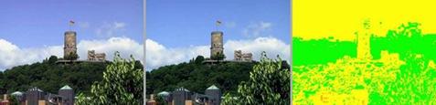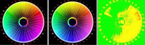 Im Testdiagramm oben sehen wir die Farbpalette des Originals (link) im Vergleich zur Projektion des Acer H95000.(mitte). Ganz rechts ist die Farbgenauigkeit als eine Art „Thermobild“ farblich gekennzeichnet: Grün markiert eine sehr gute Farbreproduktion, gelb leichte Abweichungen und die orangeroten Partien des Thermobildes kennzeichnen starke Abweichungen.