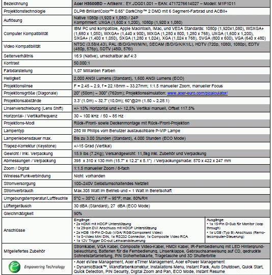 Mit dem H9500BD zeigt der taiwanesische Elektronikhersteller Acer, dass er sich nicht nur auf besonders kostengünstige Einstiegsprojektoren beschränken muss, sondern auch konkurrenzfähige Modelle im gehobenen Preissegment bieten kann. Wobei zu bemerken ist, das auch der H9500 angesichts seiner technischen Ausstattung ein überdurchschnittlich günstiges Angebot darstellt.