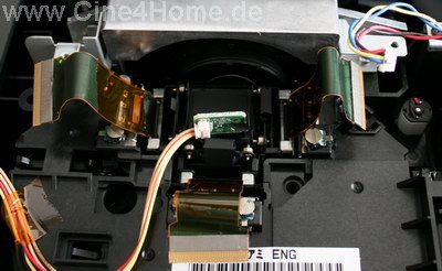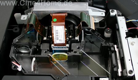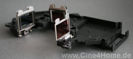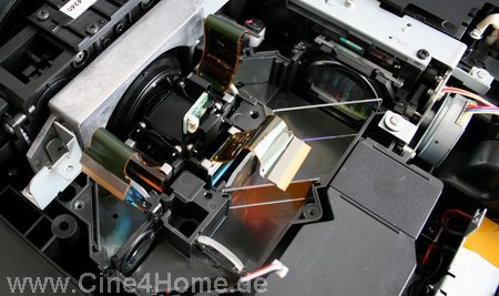 Von den Polarisationsfiltern hängt vornehmlich der Kontrast und mit ihm die Plastizität des projizierten Bildes ab. Im Bild oben ist die leichte Färbung der Gläser zu erkennen. Die einzelnen LCDs sorgen schließlich für die eigentliche Lichtmodulation. Das Licht wird polarisiert, durch das LCD reflektiert oder hindurch gelassen, und anschließend werden die drei Grundfarben durch ein Glasprisma wieder übereinander gelagert und verlassen die Optik als ein gemeinsames Farbbild.