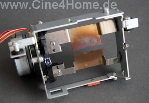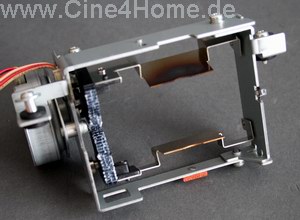 Mittlerweile in die dritte Generation geht die integrierte adaptive Licht-Blende, wie sie in allen aktuellen Heimkino-LCD-Projektoren in unterschiedlichen Varianten zum Einsatz kommt. Die adaptive Blende befindet sich wie bei fast allen Modellen direkt am Anfang des Lichtweges vor der Projektionslampe. Mit zwei Flügeltüren kann die Blende sich öffnen und schließen und so den Lichtstrom der Lampe kontrollieren. Bei Szenen mit wenig Licht und viel Schwarzanteil schließt sich die Blende, bis nur noch ein kleiner Lichtspalt übrig bleibt (siehe Bild oben). Bei hellen Szenen hingegen legen sich die Flügel in eine horizontale Lage, so dass das Lichtfenster maximal groß wird und genügend Licht in den Lichtweg gerät: