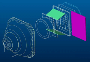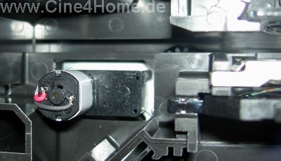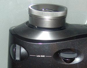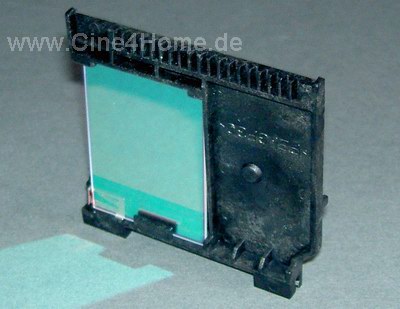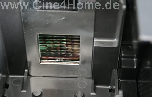 Im Bild oben ist der hochwertige Filter des Projektors zu erkennen. Seine Zyan-Farbe täuscht: Die Kamera nimmt hierbei lediglich die reflektierenden Lichtanteile des Filters auf. Da der Filter vornehmlich rot hindurch lässt, reflektiert er Grün+Blau (Zyan), was ihm seinen türkisfarbenen Schimmer verleiht. Der Filter ist nicht fest im Lichtweg verbaut, sondern kann bei Bedarf vom Anwender per Fernbedienung hinzugeschaltet werden. Ein kleiner Motor schiebt dann den Filter wie ein Dia vor die Lampe.