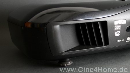 Die Lamellen des Abluftkanals sind dabei vorbildlich schräg gestellt (vgl. Bild oben), so dass kein Hitzeflimmern im Bild entsteht. Die Belüftung arbeitet angenehm leise, glücklicherweise hat Epson beim TW1000 einen Eco-Modus eingeführt, der in jedem Bildmodus aktivierbar ist, ein großes Manko des TW600/700 ist damit behoben.