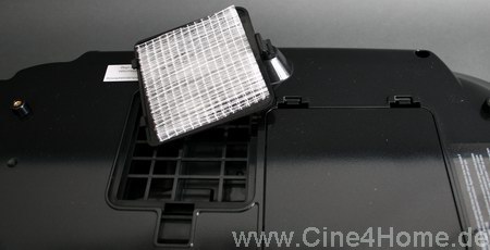 Nach Lösen weniger Schrauben kann das Lampenmodul gewechselt werden. Die Platzierung des Lampenschachts auf der Geräteunterseite ist aber wenig glücklich. So muss der Projektor bei Deckenmontage aus der Halterung genommen werden.