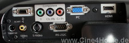 1.2 Anschlüsse / Bildsignale (Know How Link hier) Optisch ebenfalls wenige Veränderungen zeigen sich bei der Anschlussfront: 1x HDMI, 2x Component (YPbPr), 1x S-Video, 1x Composite und 1x RGB H/V sind vorhanden. Die Ausführung des zweiten Komponenteneingangs als japanische D4-Variante ist zwar hierzulande wenig praktisch, doch liegt dem Projektor ein sinnvoller Scart-Adapter bei, so dass dieser Eingang für die Verbindung zu herkömmlichen Satelliten-Receivern geradezu prädestiniert ist.