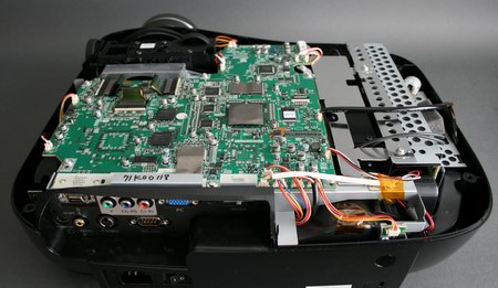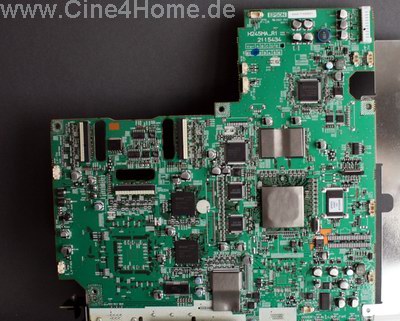 Nach dem Abnehmen des Deckels werden wir erneut stark an den kleinen Bruder TW700 erinnert, der Aufbau scheint gleich. Wesentlich größer und komplett anders konstruiert ist allerdings die Signalelektronik des TW1000 und mit ihr sind wir auch schon bei dem ersten Alleinstellungsmerkmal des Epson Beamers: