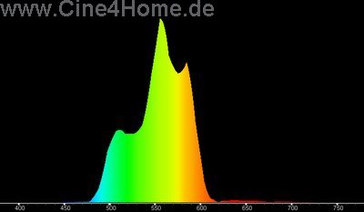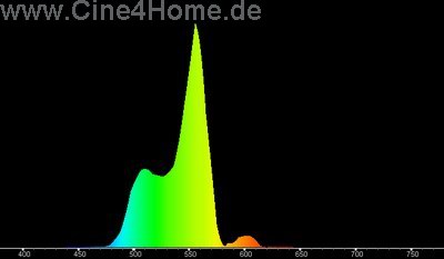 Ausgerechnet die "grünen" Wellenbereiche zwischen 500 und 550Nm, die zB. von einer Xenon Lampe gut erzielt werden, fehlen im Spektrum. Dies alleine wäre noch vertretbar, denn dies ist bei UHP Lampen nicht selten der Fall, doch die hohen gelb-orangefarbenen Spektralanteile habe in der grünen Grundfarbe nichts zu suchen. Sie hätten durch bessere Farbaufspaltung im Lichtweg (dichroitische Spiegel) abgetrennt werden können. Wahrscheinlich hat man sie nicht herausgefiltert, um die maximale Lichtleistung auf über 1000 Lumen zu halten, dies ist ein beliebter Trick, um die Maximalhelligkeit durch gelbe Anteile zu erhöhen. Hier zeigt sich aber, wie Marketing sich negativ auf die Bilddarstellung auswirken kann. Besser wäre ein großer nativer Farbraum mit 800 Lumen gewesen. Daher handelt sich der TW1000 in dieser Domäne negative Punkte ein. Viel Helligkeit und kräftiges Grün ist mit ihm nicht möglich, allenfalls ein blasses "Apfelgrün".