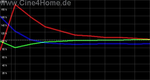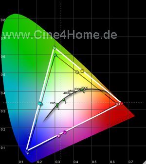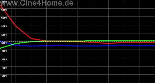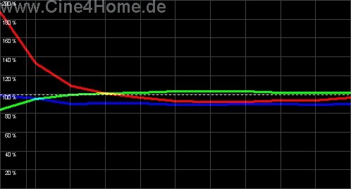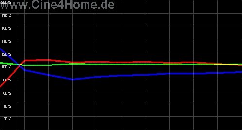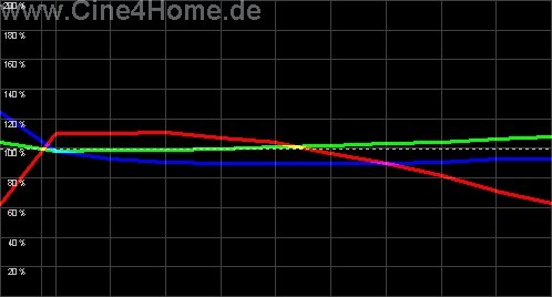Obiges Diagram zeigt das Werkspreset ohne Nachkorrektur, es ist als sehr gute Annäherung an die Norm anzusehen. Lediglich ein geringer Blauüberschuss ist zu erwähnen, der die Bilddarstellung leicht zu kühl ausfallen lässt. Doch die Konkurrenz ist härter geworden, andere FullHD Projektoren wie ein Mitsubishi HC5000, Panasonic-PT-AE1000 oder JVC HD1 bieten ab Werk bereits noch genauere Abstimmungen. Durch die guten Einstellmöglichkeiten kann man das Ergebnis weiter perfektionieren. In nahezu allen Helligkeitsbereichen ist ein Abgleich auf die richtige Farbtemperatur möglich.