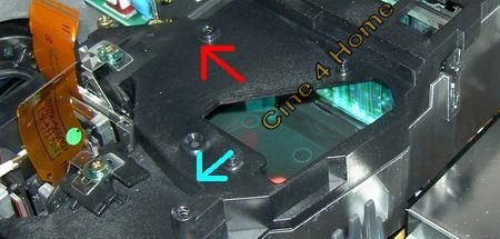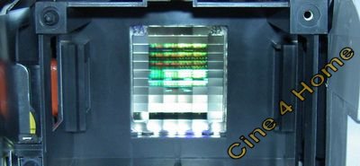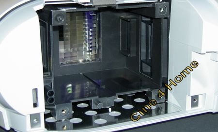Ein wenig unglücklich hingegen ist die Platzierung des Luftfilters, ebenfalls auf der Geräteunterseite. Um ihn zu reinigen muss das Gerät aus der Halterung gelöst werden. Als einzigartiges Feature im Vergleich zu den Konkurrenzmodellen ist der im Lichtweg integrierte Farbfilter, der in Verbindung mit einer Streulichtblende eine optimale Kontrastausnutzung bei korrekter Farbdarstellung mit einem verbesserten Schwarzwert kombinieren soll. Das von uns für viele Modelle angebotene "Projektor-Tuning" ist also bei dem Epson Gerät bereits ab Werk eingebaut, mit welchen Erfolgen in der Projektionsqualität, zeigt unser Bildtest-Kapitel dieses Tests. Um dem Filtermechanismus technisch zu untersuchen, haben wir einen Blick