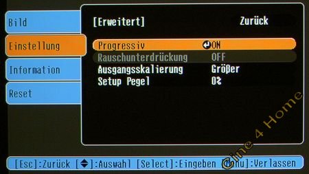 How Link hier) Leider hat Epson bei dem TW200 ebenfalls auf ein leistungsfähiges De-Interlacing verzichtet. Genau wie bei dem digitalen Videoeingang bleibt dieser "Luxus" dem wesentlich teureren TW500 Modell vorbehalten, das hochwertige Progressive-Technologie aus dem Hause Faroudja eingebaut hat. Der TW200 bietet im "Einstellung/Erweitert" Menü die "Progressive" Option "On / Off". Hier ist die Bezeichnung durchaus zutreffend: Im "Off" Modus wird die Umwandlung von eingehenden Halbbild-Signalen durch simple Zeilenverdopplung durchgeführt, flimmernde Kanten und mäßige Auflösung sind die Folge. Der "Off"-Modus ist daher nicht zu empfehlen. Im "On" Modus zeigt der Projektor einen auf Videomaterial (Fernsehshows, Sport etc.) ausgerichteten Modus, der nach "Motion Adaptive" Verfahren arbeitet: Unbewegte Bildelemente werden aus zwei aufeinanderfolgenden Halbbildern zusammengeflochten, bewegte Elemente werden von der Videoelektronik eigenständig hochinterpoliert. Dieses Verfahren erlaubt gute Ergebnisse, leider ist diese Interpolation aber nicht sehr genau, so dass schnell bewegte Elemente im Bild unscharf erscheinen. Für Filmmaterial von DVD oder aus dem Fernsehen bietet der TW200