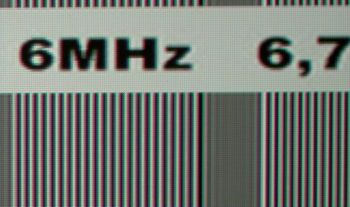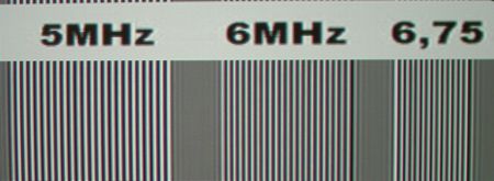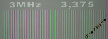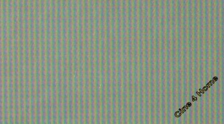 Das Testbild oben, bestehend aus einzeiligen weißen und grauen Linien, zeigt leichte Linearitätsschwankungen in der Darstellung. Jede zweite Zeile erscheint in ihrer Helligkeit reduziert bzw. dicker als die anderen. Solche Abweichungen sind allerdings derart marginal, dass man von keiner "wirklichen" Beeinträchtigung der Detaildarstellung reden kann.