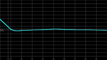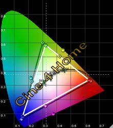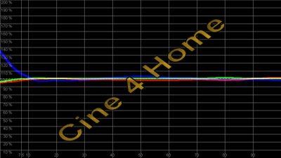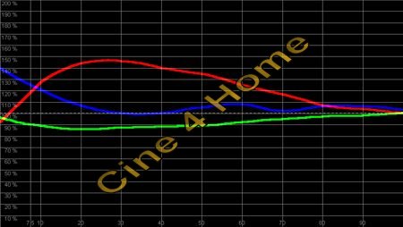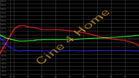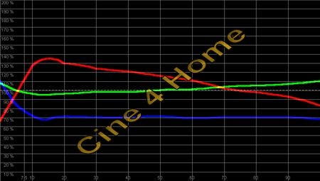 Das Messdiagramm zeigt: In dunklen Bereichen ist Rot stark überbetont, so dass die Bilddarstellung zu warm erscheint. Ab einer Helligkeit von 70% (helle Filmszenen), kippt die Farbtemperatur in zu "kühl" um mit einem zu hohen Grünanteil. Ein Blaumangel zieht sich über alle Helligkeiten hinweg. Mit diesen Ergebnissen ist in keiner Bildkomposition eine akkurate Farbdarstellung gegeben. Der Dynamik-Modus ist demnach für eine natürliche Kino-Reproduktion nicht empfehlenswert. Gleiches gilt für den Modus "Wohnzimmer", das Messergebnis