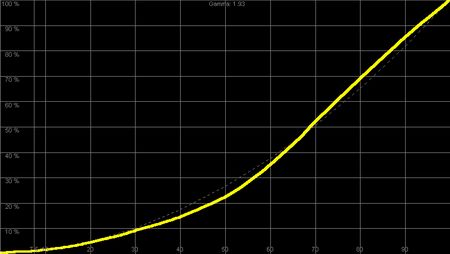 und beeinträchtig den Kontrasteindruck sichtbar. Zudem zeigt die Gammakurve ein ungewünschtes S-Kurvenverhalten, das die Bilddynamik in hellen Bereichen beeinträchtigt. Genau das Gegenteil zeigt sich beim Bildmodus "Wohnzimmer".