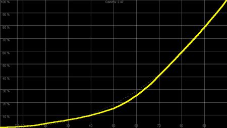 Helligkeitsanstiege von 2,5 und darüber sind wirklich nur in sehr dunklen und Kino-optimierten Räumen zu empfehlen, da hier dunkle Details nur sehr fein voneinander optisch getrennt werden. Der größte Dynamikbereich wird für mittlere und helle Bildteile reserviert. Aus diesem Grunde ist die Bezeichnung "Wohnzimmer", wie so viele Menüpunkte, eher als irreführend zu bezeichnen. Sehr akkurate Ergebnisse in der Helligkeitsverteilung ergeben sich im