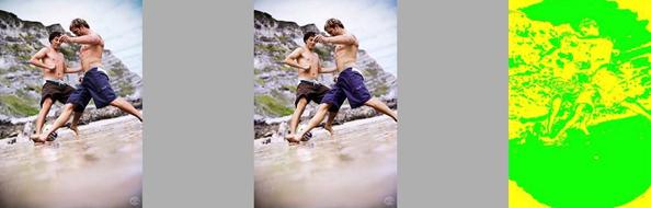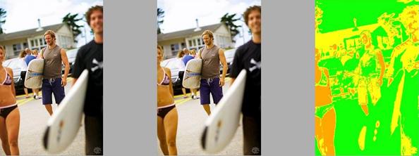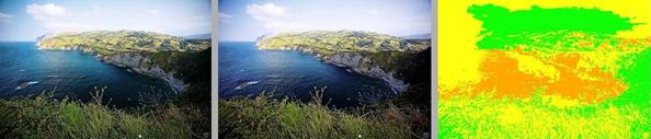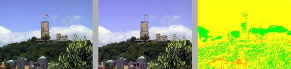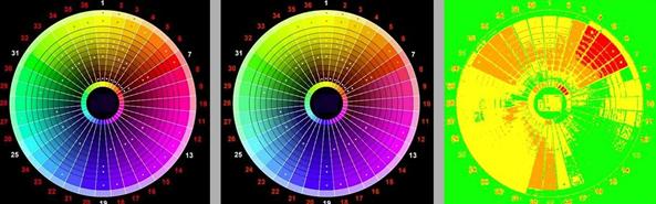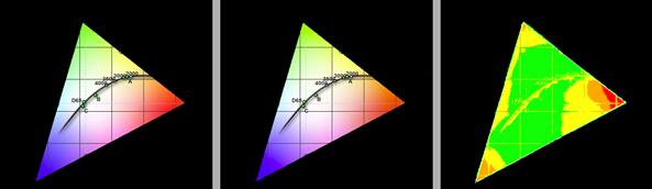 Unsere DeltaE-Analyse (rechts) der Farbpalette zeigt die resultierende Farbgenauigkeit der Projektion (Mitte) gegenüber dem Original (links): Grün markiert eine gute Farbgenauigkeit, Gelb eine akzeptable, Orange sichtbare Abweichungen und Rot deutliche Abweichungen.