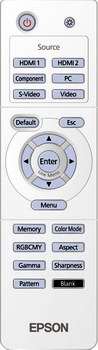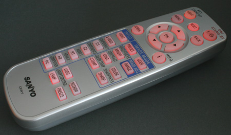 Die Sanyo Fernbedienung ist ebenfalls durchdacht und gut strukturiert: Im oberen Teil befinden sich die gängigsten Tasten in besonders großer Ausführung, darunter direkte Eingangswahltasten (links) und wichtige Bildparameter (rechts). Der Projektor reagiert zuverlässig und schnell auf die Kommandos, auch in größeren Räumen, so muss es sein.