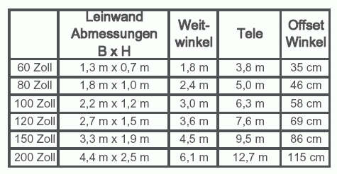 Weit abgeschlagen geben sich die DLP-Brüder in Sachen Aufstellung. Nicht nur, dass sie über keinerlei optischen Lensshift verfügen, ihre winzig kleinen Objektive erlauben auch nur eine minimale Zoom-Anpassung des Bildes. Mit nachfolgender Tabelle, die für beide Projektoren dank fast baugleicher Lightengine identisch ausfällt, kann man die Unterschiede leicht ablesen: