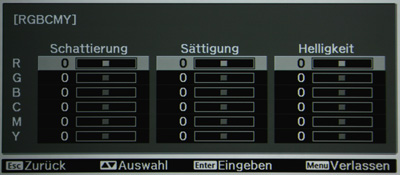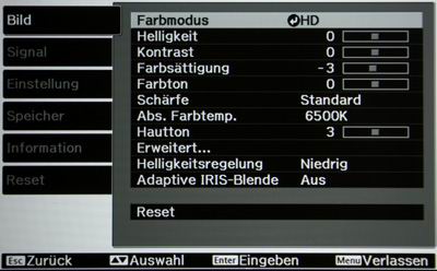 Wieder hat man es sich bei Epson leicht gemacht und einfach die Menüs komplett von den teureren Modellen übernommen. Und wiederum überzeugt das Ergebnis: In fünf Hauptkategorien befinden sich unzählige von Bildparametern, nahezu jedes Detail kann bei dem Projektor vom Anwender beeinflusst werden.